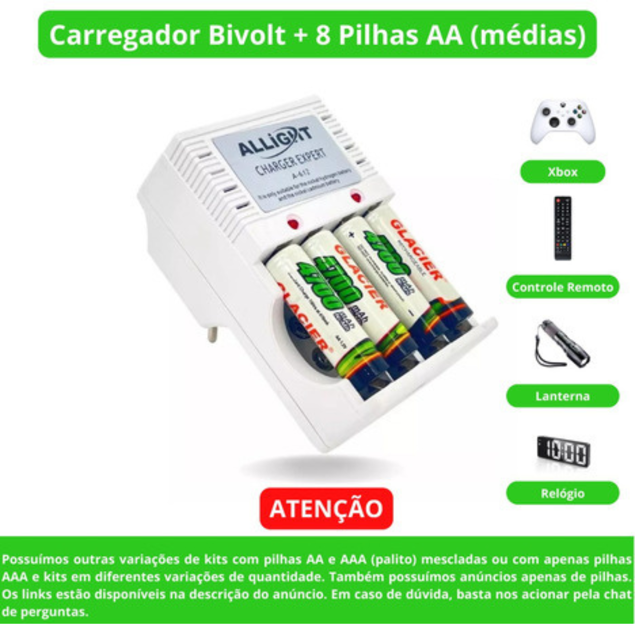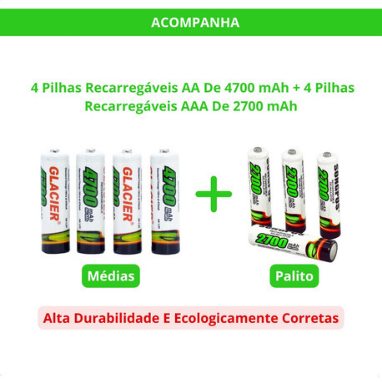 Pilhas Recarregáveis AA e AAA: O kit inclui 8 pilhas recarregáveis, sendo 4 do tipo AA e 4 do tipo AAA, compatÃveis com uma ampla variedade de dispositivos eletrônicos.
