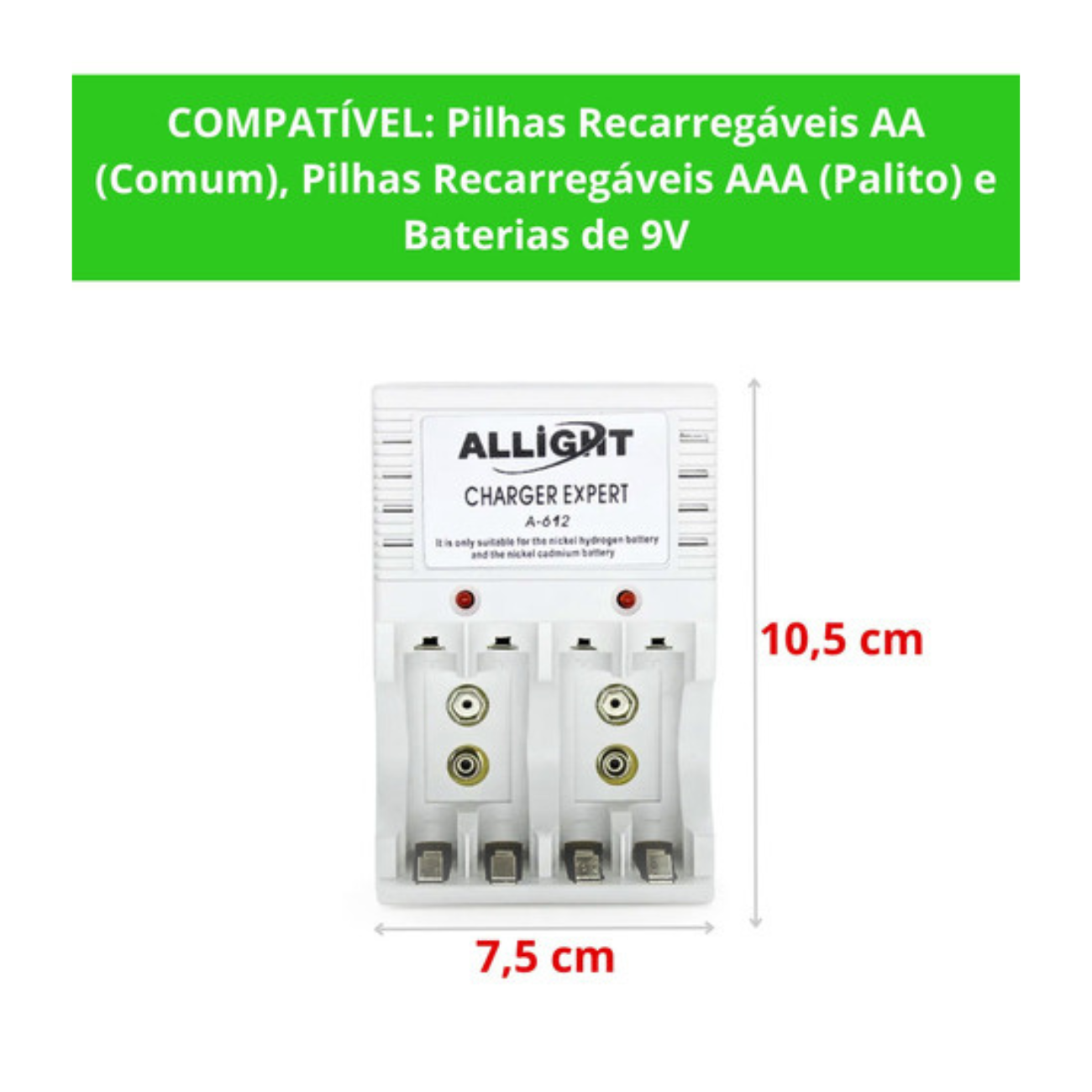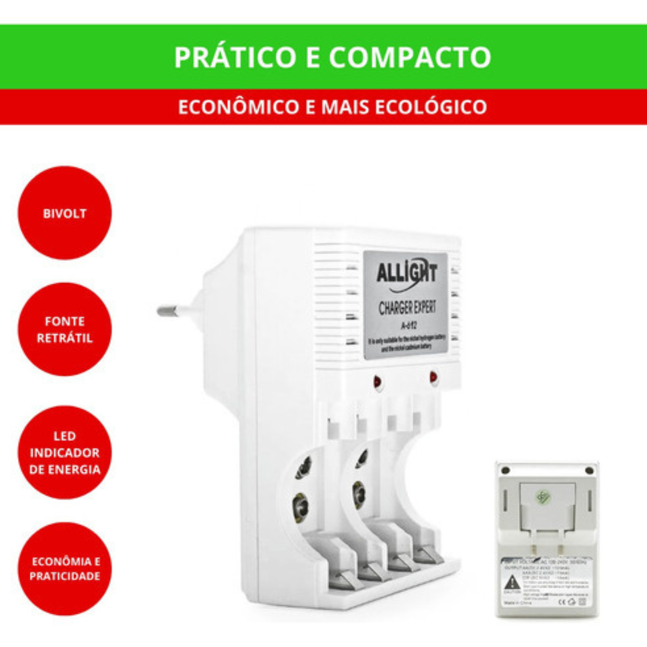 Carregador Rápido Bivolt: O carregador rápido permite recarregar suas pilhas de forma eficiente e segura, com suporte para tensões 110V e 220V, tornando-o perfeito para uso em qualquer lugar.